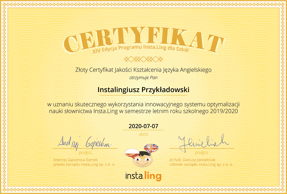 Wszyscy nauczyciele, którzy spełnią warunki podane na początku semestru, otrzymają od nas certyfikaty potwierdzające umiejętność wykorzystania InstaLing w nauczaniu języków i uczestnictwo w obecnej Edycji Programu. Również szkoły, w których co najmniej dwóch nauczycieli uczestniczy w Programie, mogą otrzymać certyfikat.